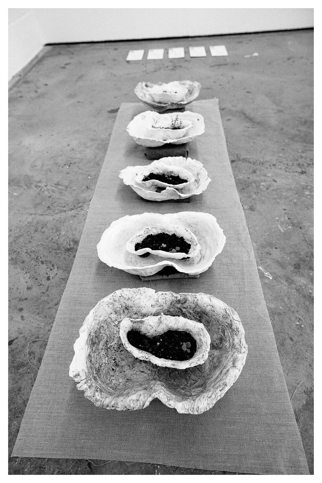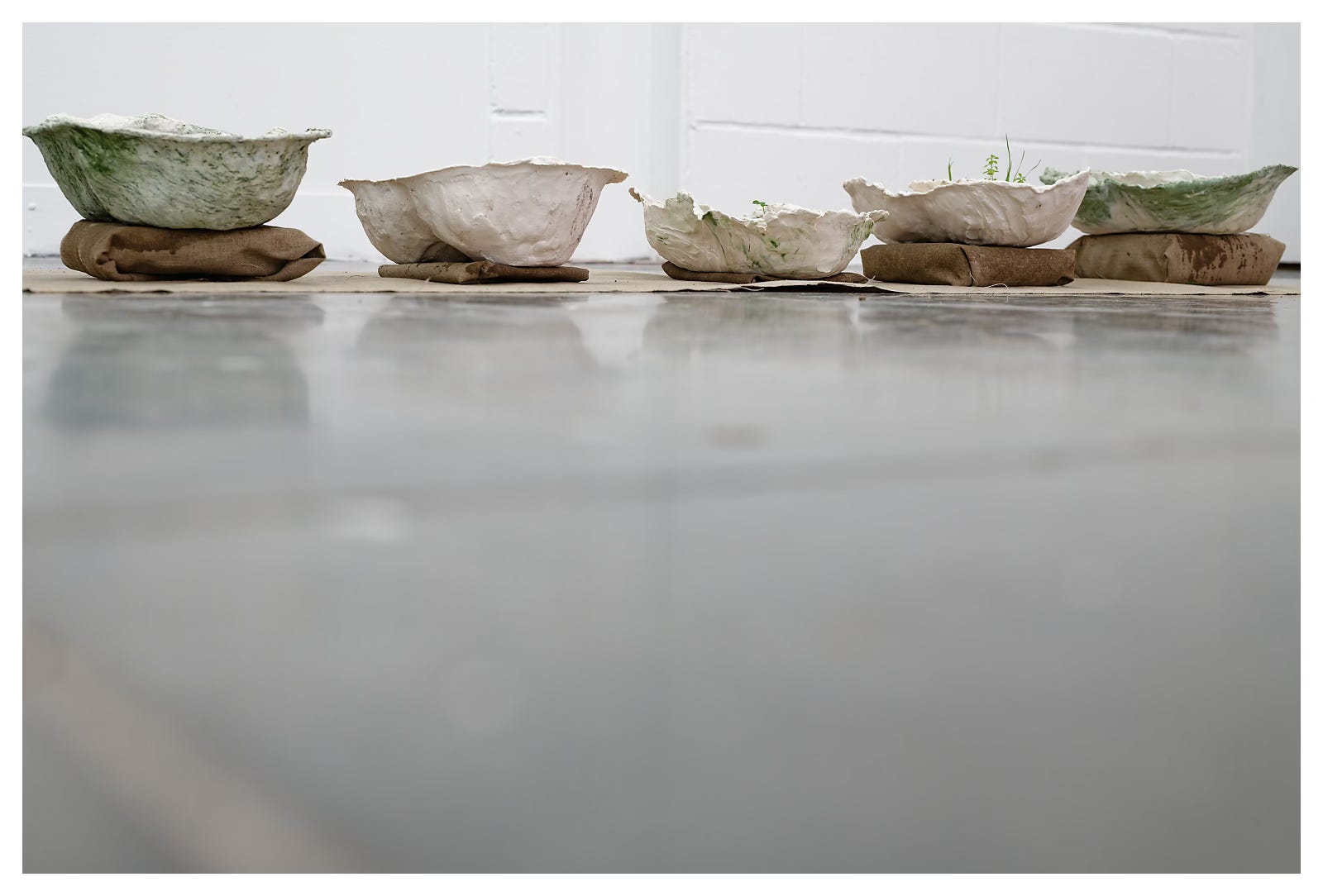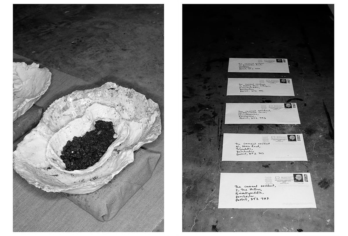 Inspired by the potential in my grandad’s pot of soil, I recently travelled back to my five childhood gardens, collecting soil from each. My dad was a farm manager and ours was not an unusual story, in that it was necessary to move frequently between tied farm housing. For us, every new garden, whilst reflecting the unfamiliar landscape, also carried something of the characteristics of our preceding garden. This was helped by my parents’ determination to take on every move several tons of flagstone, walling and nine greensand staddle stones, transforming our new garden into a partial iteration of the one we needed to leave behind. These gardens became a source of continuity and in their relative familiarity, suggested home far more than each new house. Returning to these places for the first time since childhood, I am intrigued by what treasures might be hidden in their soil and through careful tending what latent seeds might grow. I’m not sure whether I am revisiting the past or imagining a future, but already tiny green shoots are appearing. I have become my child-like self, and each small pot of soil, a complete garden full of wonder and possibility.